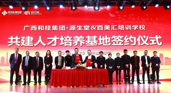 1月20日,源生堂與百美匯培訓(xùn)學(xué)校共建人才培訓(xùn)基地簽約儀式,在廣西和桂集團(tuán)2018年年會(huì)現(xiàn)場(chǎng)隆重舉行。此次簽約標(biāo)志著首個(gè)中國(guó)天然養(yǎng)發(fā)人才培養(yǎng)基地的成立。廣西和桂集團(tuán)總裁黃偉文先生、源生堂執(zhí)行總經(jīng)理舒志華女士、百美匯培訓(xùn)學(xué)校校長(zhǎng)王勇先生等領(lǐng)導(dǎo)出席本次簽約儀式。中央電視臺(tái)、廣西電視臺(tái)、南國(guó)早報(bào)、網(wǎng)易網(wǎng)、中國(guó)網(wǎng)、中國(guó)經(jīng)濟(jì)時(shí)報(bào)、新浪新聞、百度新聞等媒體,以及源生堂供應(yīng)商、加盟商、員工等近千人,共同見(jiàn)證了首個(gè)中國(guó)天然養(yǎng)發(fā)人才基地的簽約儀式。